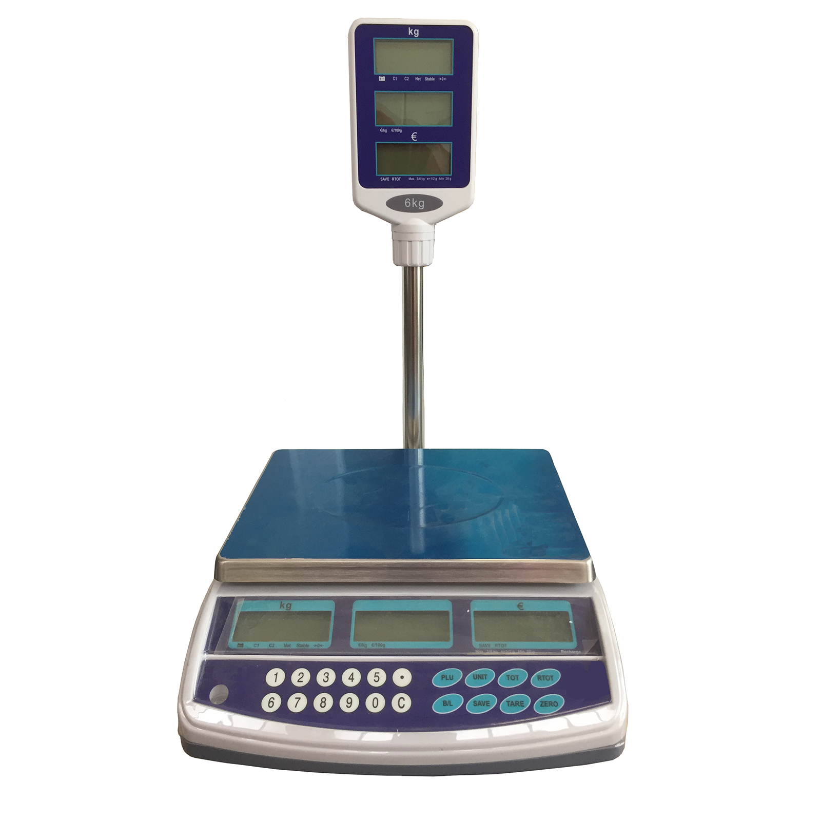 - Triplo display LCD su tastiera e su colonna oppure sul retro, con grandi cifre ben visibili, per indicazione simultanea di peso, prezzo e importo. Disponibile per la versione da 6 Kg il modello senza colonna con 6 display lato operatore/cliente